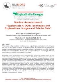 On October 30, 2025, at 3:45 p.m., in room P2.1, building MO27 – Department of Engineering “Enzo Ferrari,” Professor Natalia Diaz-Rodriguez, University of Granada, will hold the seminar "Explainable AI (XAI) Techniques and Explanations: Images and Tabular Data”