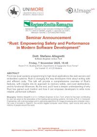 On November 7th, 2025, in room P1.6 of building MO25, Department of Engineering “Enzo Ferrari,” at 3:45 PM, Dr. Stefano Allegretti, Software Engineer at Zuru Tech, will hold a seminar titled “Rust: Empowering Safety and Performance in Modern Software Development.”