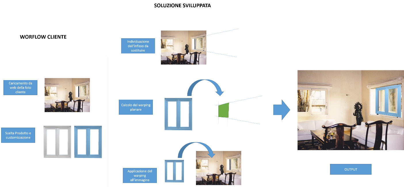 Tale attività pone particolari sfide nell’ambito dell’analisi di immagine. In particolare l’individuazione degli infissi può essere realizzata tramite procedura automatica o semiautomatica. La proiezione e l’applicazione del modello personalizzato sfrutterà invece tecniche di proiezione da 2D a 2D di tipo omografico per l’applicazione del prodotto all’immagine cliente.