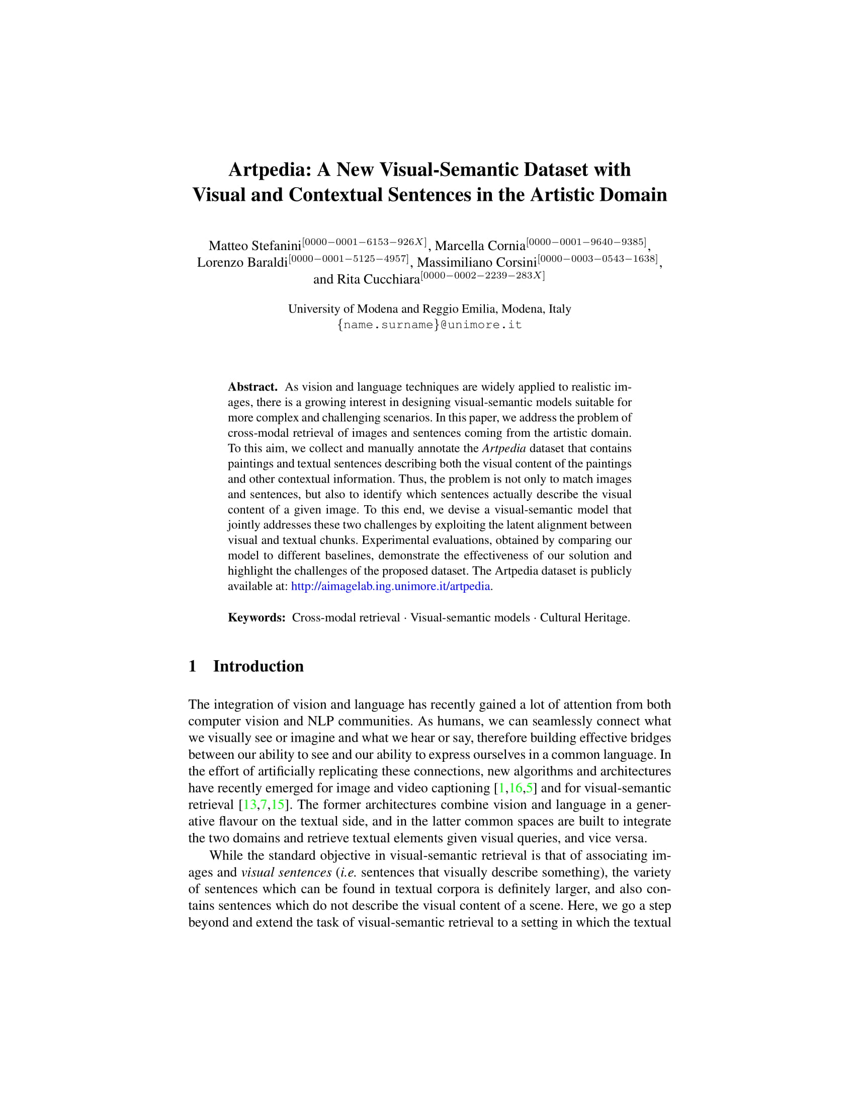2 Stefanini, Matteo; Cornia, Marcella; Baraldi, Lorenzo; Corsini, Massimiliano; Cucchiara, Rita "Artpedia: A New Visual-Semantic Dataset with Visual and Contextual Sentences in the Artistic Domain" Image Analysis and Processing – ICIAP 2019, Trento, Italy, pp. 729 -740 , 9-13 September, 2019, 2019 | DOI: 10.1007/978-3-030-30645-8_66 Conference