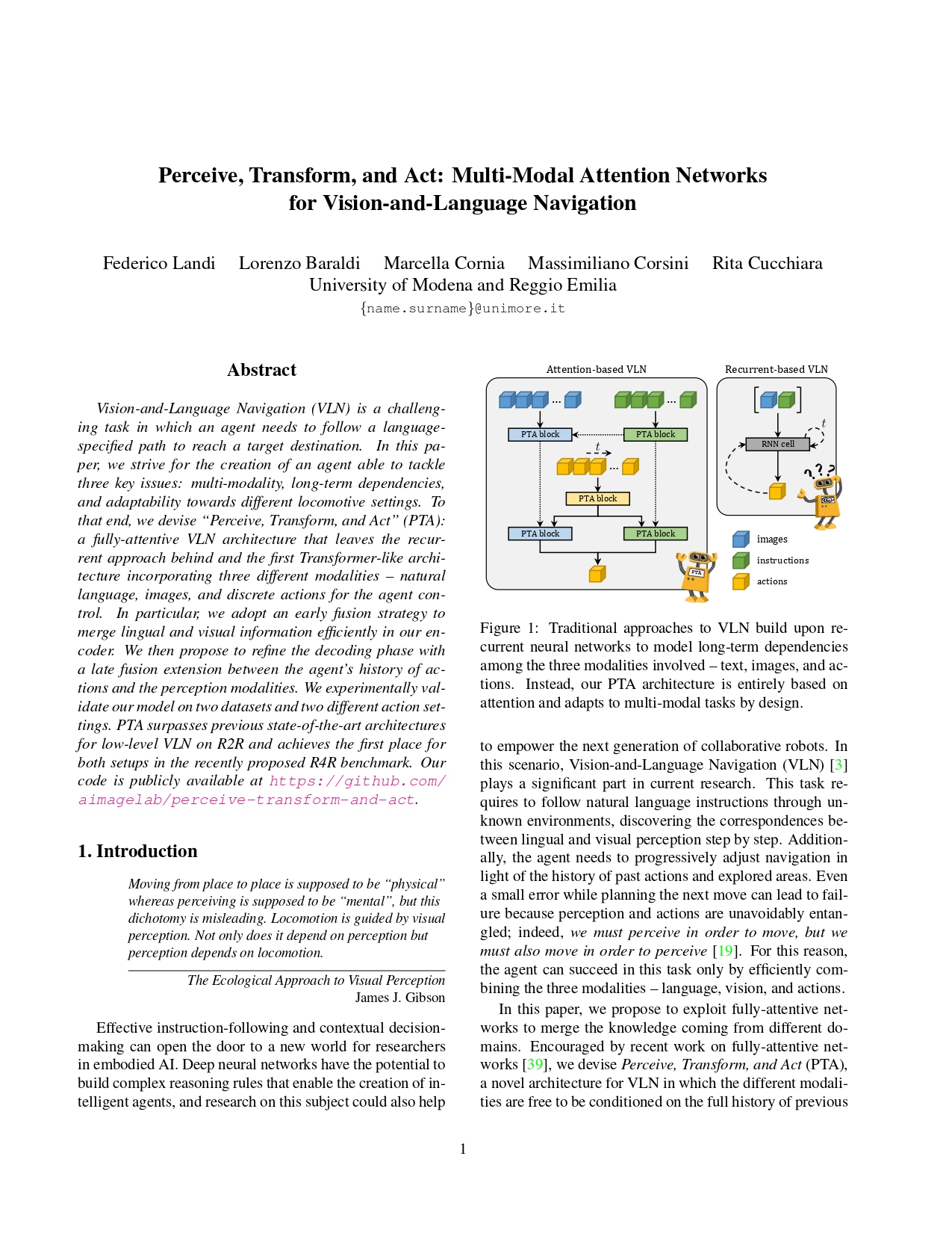 In this paper, we strive for the creation of an agent able to tackle three key issues: multi-modality, long-term dependencies, and adaptability towards different locomotive settings. To that end, we devise "Perceive, Transform, and Act" (PTA): a fully-attentive VLN architecture that leaves the recurrent approach behind and the first Transformer-like architecture incorporating three different modalities - natural language, images, and low-level actions for the agent control. In particular, we adopt an early fusion strategy to merge lingual and visual information efficiently in our encoder. We then propose to refine the decoding phase with a late fusion extension between the agent's history of actions and the perceptual modalities. We experimentally validate our model on two datasets: PTA achieves state-of-the-art results in low-level VLN on R2R and achieves the first place in the recently proposed R4R benchmark.